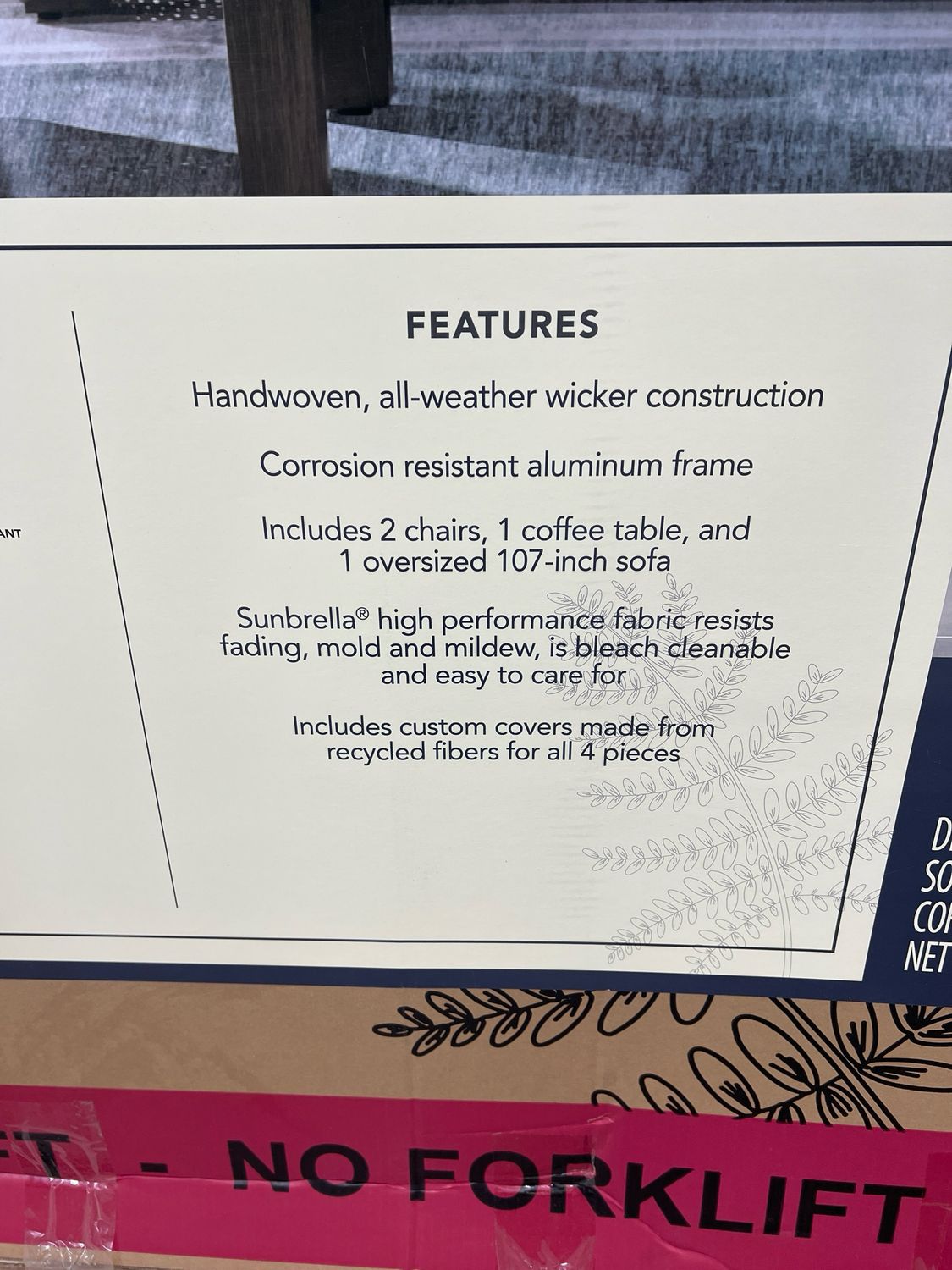 Members Mark 4 piece extra large seating set. This item is new in box. Handwoven, all-weather wicker construction. Â Our price is $1,199!!! This item is originally $2,459 at Sam’s Club. Over 50% savings!!
